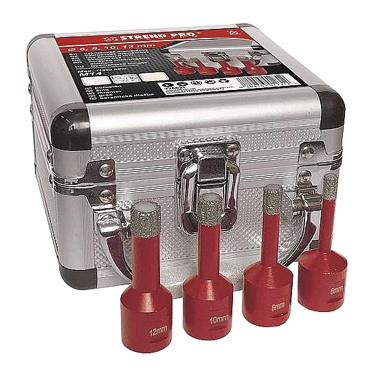 Sada diamantových vykružovačů, 6-8-10-12 mm, M14, profiPoužití pro keramické dlaždice, mramor, žulu, gres, porcelán- třída Industrial- šířka diamantu 10 mm- na suché vykružování- maximální otáčky 11000 rpm przeczytaj całość