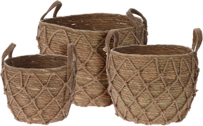 BASKET SET OF 3 SIZES, EACH PIECE WITH 2 HANDLES. MATERIAL: CATTAIL LEAF. WITH ROPE AROUND EACH BASKET. EACH PIECE WITH HANGTAG, EACH SIZE WITH UNIQUE BARCODE/ BASKET LARGE(8719987 800795), 360X360X270MM, Hangtag/ BASKET MEDIUM(8719987 800856), 300X300X240MM, Hangtag/ BASKET SMALL(8719987 800917), 250X250X210MM, Hangtag / CFT 4,19,(2.201/40ft HQ)