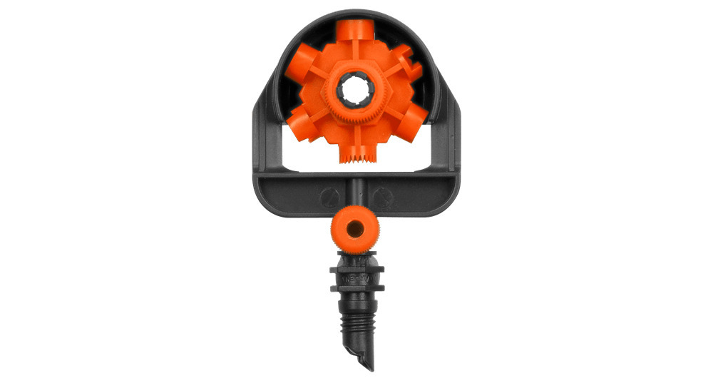 6-strefowa dysza zraszająca firmy GARDENA jako część systemu GARDENA Micro-Drip-System jest idealna do elastycznego nawadniania. Dzięki obrotowemu pokrętłu można ustawić żądany kształt. Możliwe kształty: 90°, 180°, 270°, 360°, pasy i końcowe pasy. Dla jeszcze większej elastyczności zasięg można regulować osobno. Za pomocą rurki przedłużającej (nr kat. 1377-20) można przedłużyć dyszę zraszającą tak, aby optymalnie nawadniać także wyższe rośliny.