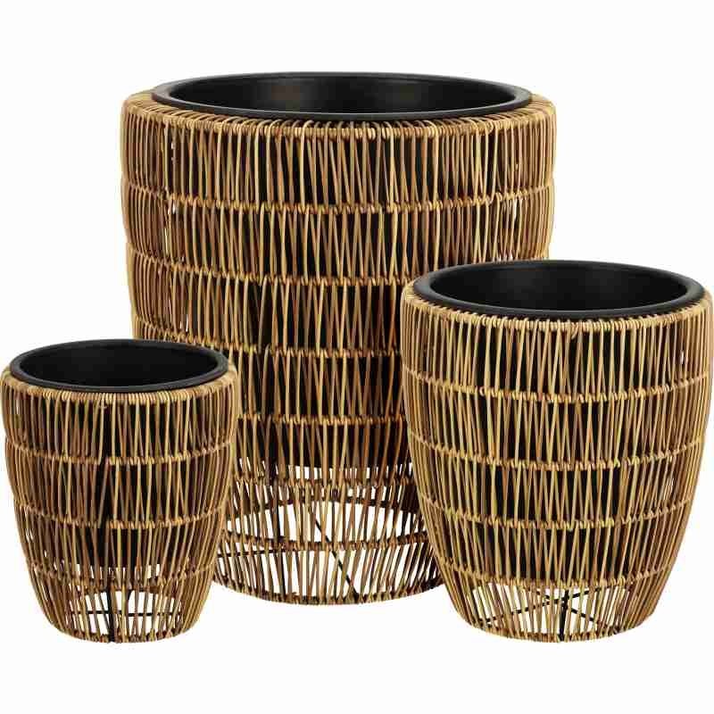 PLANT POT ROUND WITH PLASTIC INSERT POT, POLY RATTAN NEW WEAVING, SET OF 3PCS: 1. DIA 21CM X HEIGHT 24CM, 2. DIA 28CM X HEIGHT 30CM, 3. DIA 38CM X HEIGHT 42CM, BROWN COLOUR (3BR20 AND 3BR24), EACH PIECE WITH HANGTAG, ASS.:3 Sizes, Hangtag (HT21)/ PLANT POT ROUND D21H24CM(8720573 855976),...