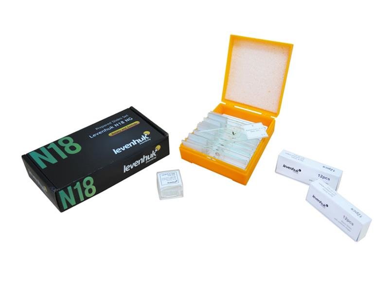 Aby móc zbadać próbkę rośliny lub innego materiału pod mikroskopem, musi ona zostać dokładnie przygotowana: bardzo cienki przekrój materiału należy położyć na szkiełko podstawowe i przykryć szkłem nakrywkowym. Ten zestaw preparatów zawiera już w pełni przygotowane próbki materiału biologicznego, dzięki czemu możesz poświęcić więcej czasu ich badaniu. W skład zestawu wchodzą także kilka pustych szkiełek podstawowych i nakrywkowych, dzięki którym możesz przygotować własne preparaty mikroskopowe. Szkiełka podstawowe i nakrywkowe wykonane są z wysoko przezroczystego szkła i zapewniają wygodne obserwacje bez odblasków i zniekształceń. Gotowe preparaty oraz szkiełka podstawowe i nakrywkowe można używać z dowolnym modelem mikroskopu.Zestaw preparatów przygotowanych do obserwacji pod mikroskopem Levenhuk N18 NG zawiera: