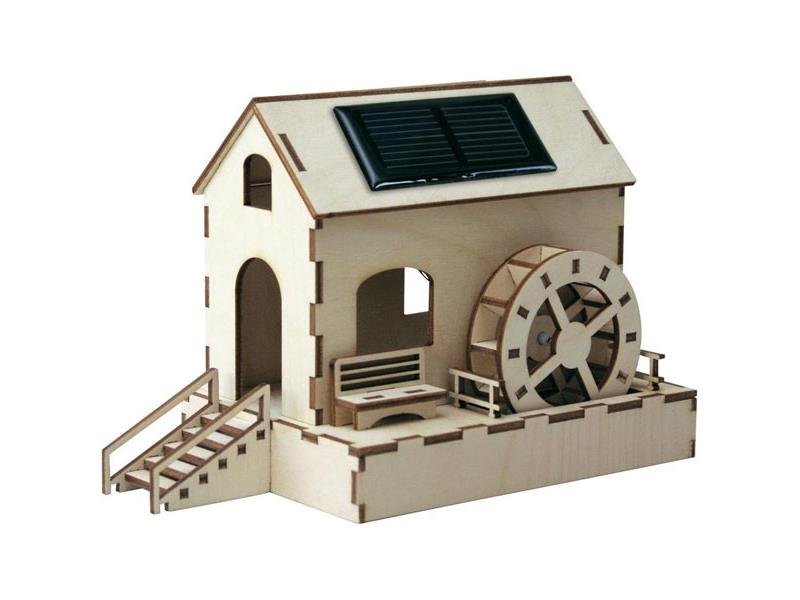 Solarny młyn wodny Ten model młyna wodnego z wiernymi detalami jest napędzany wysokiej jakości ogniwem słonecznym. Gdy pada na nie promieniowanie słoneczne, koło wodne zaczyna się obracać. Najnowocześniejsze technologie produkcji nadają temu modelowi wysoką precyzję. Już samo składanie stanowi zabawę. 3 mm grubości drewno bukowe można po złożeniu dowolnie pomalować.
