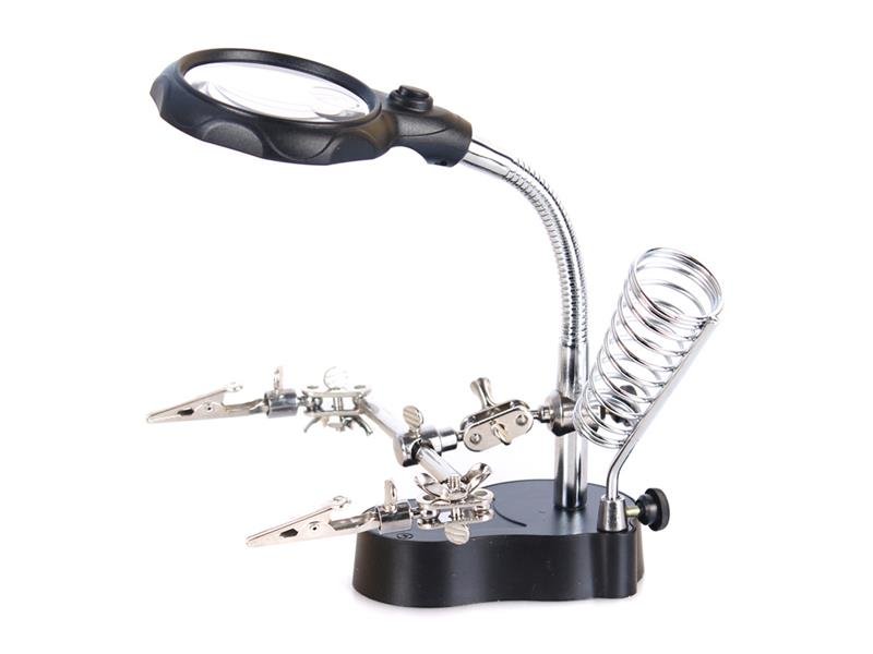 Lupa Levenhuk Zeno Desk D3 je skvělá pro práci s plošnými spoji, činnosti s elektronikou vyžadující vysokou přesnost, pájení, opravy, výrobu šperků nebo modelování. Kromě zvětšující čočky na ohebném krku má Lupa Levenhuk Zeno Desk D3 také „třetí ruku“. Tento nástroj pomáhá kvalitně opravovat desky osazené elektronikou nebo drobné předměty a déletrvající práce je díky němu mnohem pohodlnější. Své nástroje můžete mít při práci stále po ruce – k tomu slouží další držák. Vestavěné osvětlení se dvěma jasnými LED diodami je účinné při práci v podmínkách slabého osvětlení. Větší čočka poskytuje zvětšení 3,5x a menší 12x.