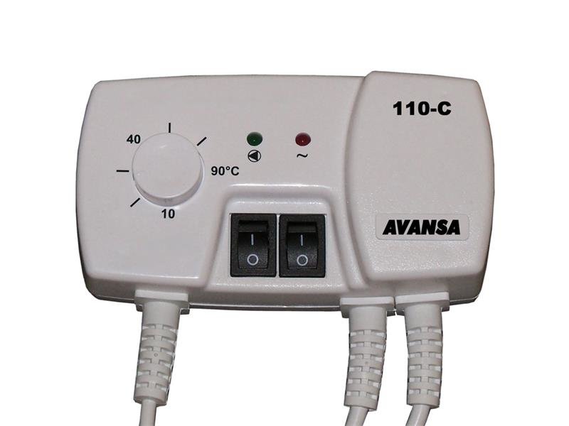 Termostat AVANSA 110-C je určen k ovládání čerpadla pro vytápění. Úkolem termostatu je zapnutí čerpadla, když teplota překročí nastavenou hodnotu a jeho vypnutí, pokud dojde k vychladnutí kotle (z důvodu jeho vyhasnutí). Tím se zabrání nadbytečné provozu čerpadla, což umožňuje šetřit elektrickou energii (v závislosti na využití kotle může být úspora až 60%) a prodloužit životnost čerpadla. To zvyšuje spolehlivost a snižuje náklady na údržbu. Teplota spínání čerpadla se nastavuje pomocí potenciometru (v rozsahu 10 ... 90 ° C). Čerpadlo se vypne, pokud naměřená teplota klesne o 5 ° C nižší než je nastavená teplota. Zapnutí nebo vypnutí čerpadla nastává přibližně po 30 sekundách - tím se zabrání přepínání čerpadla při náhlých teplotních změnách. Regulátor má kromě potenciometru i 2 vypínače. První slouží k zapnutí / vypnutí regulátoru (signalizováno červenou diodou). Druhý slouží na ruční zapínání čerpadla (zelená dioda).
