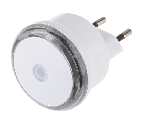 Lampka nocna LED do gniazdka w kolorze białym. Źródłem światła są 3 diody LED. Lampka nocna LED automatycznie rozróżnia dzień i noc, automatycznie się włącza i wyłącza.