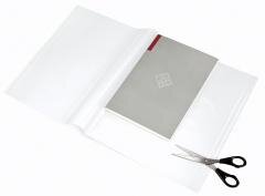 Okładka na zeszyt lub książkę do formatu A4, wykonana z polipropylenu, bezbarwna, przezroczysta, na bokach paski taśmy samoprzylepnej, przycinana na potrzebną wysokość. Pakowana po 5 sztuk. przeczytaj całość