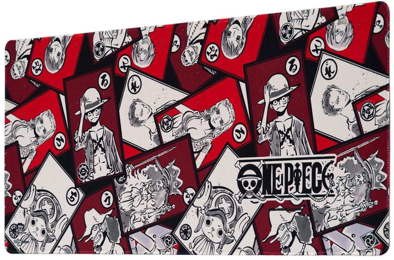 Oficiální podložka z katalogu produktů s logem, fotografiemi a grafikou z populární japonské mangy One Piece.