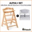 Alpha+ SET Vysoce kvalitní jídelní židle ze dřeva s prémiovým nátěrem s pohodlným polstrováním Mezi-nožní pás v koženém vzhledu Vysoce kvalitní lazurování Povrchově ušlechtilé kovové prvky Rostoucí od 6 měsíců - na celý život Obzvláště stabilní, odolná proti převrhnutí, zátěž do 90 kg Přírodní...