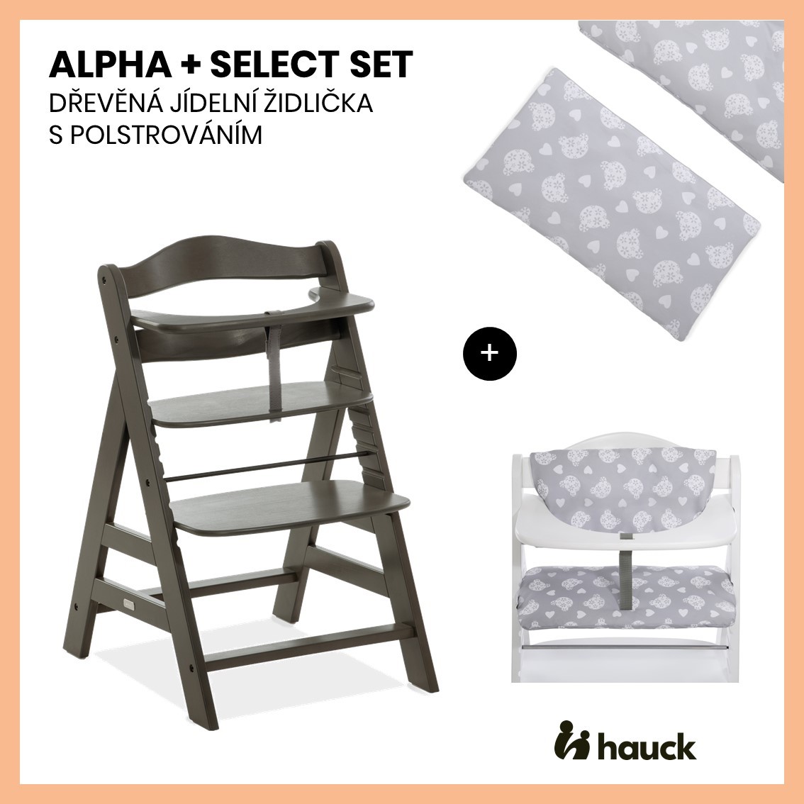 Hauck Alpha+ Select set 2v1 dřevěná židle, charcoal + polstrování Teddy grey