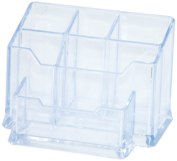 Przybornik na biurko, wykonany z odpornego na pęknięcia polistyrenu 5 przegrody na akcesoria piszące 1 przegroda na karteczki (76x76mm) wymiary: 155x105x101mm kolor transparentny przeczytaj całość
