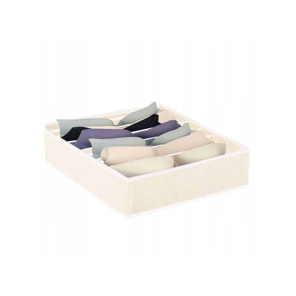 Praktyczny tekstylny organizer do szuflady z 7 oddzielnymi przegródkami. Nadaje się do przechowywania biustonoszy lub innych części bielizny, kosmetyków i innych drobiazgów. Kompaktowe, składane wykonanie z usztywnionymi bokami. Wymiary 30x30x10 cm. przeczytaj całość