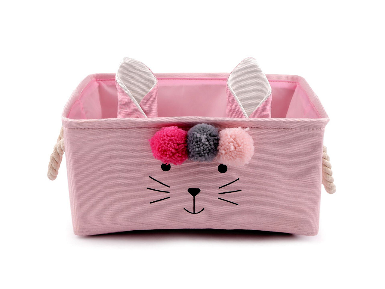 Tekstylny bawełniany kosz do przechowywania w kształcie króliczka ma szerokie możliwości zastosowania. Dzięki pomponikom i sterczącym uszom pokochają go przede wszystkim dzieci oraz różnej wielkości dziewczynki. Może służyć jako miejsce do przechowywania różnych przedmiotów. Jest usztywniony, ma uchwyty do rąk, które są praktyczne do przenoszenia. Stanie się praktycznym dodatkiem nie tylko do pokoju dziecięcego.