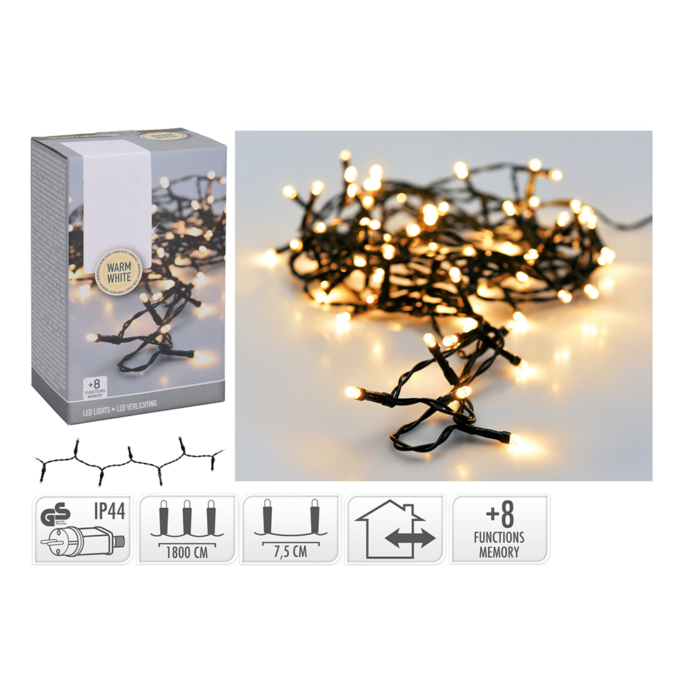 Svítící řetěz obsahuje 240 LED (5 mm) bílá teplá.8 režimů svícení s pamětícelková délka řetězu: 21 mdélka přívodního vodiče: 3 mbarva vodičů: černávzdálenost mezi jednotlivými LED: 7,5 cmnapájecí adaptér 230V / 31Vvhodné pro venkovní i vnitřní použití (krytí IP44) przeczytaj całość