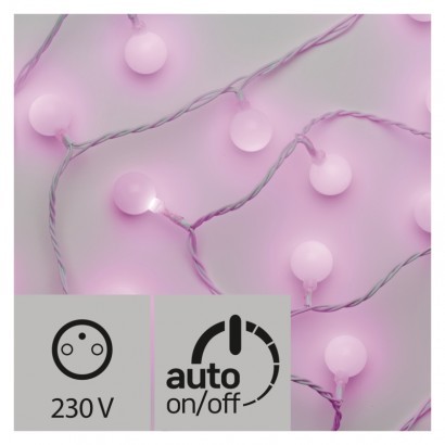 LED světelný cherry řetěz – kuličky 2,5cm, 4m, růžová, čas.