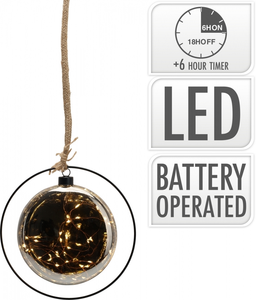 Dekorativní kovový kruh s plochou skleněnou LED koulí na jutovém provazu. Ve skleněné kouli je 30 LED diod od sebe vzdálených 5 cm. Napájení 3x AA bateriemi (nejsou součástí výrobku). Součástí je také časovač 6/18h.Materiál: kov, sklo, jutaRozměry:délka 80 cmprůměr černého kruhu 20 cmplochá koule... przeczytaj całość