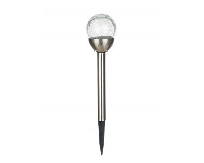 Lampa solarna ze stali nierdzewnej - o wysokości 38,5 cm ze szklanym dekoracyjnym kloszem w kształcie kuli z motywem pajęczyny o średnicy 8 cm, źródło światła - 1 biała dioda LED i 1x kolorowa dioda LED. Podczas pracy przełącznikiem można wybrać tryb świecenia: stałe białe światło lub zmieniające się spektrum kolorów. Lampa solarna jest funkcjonalnym i jednocześnie dekoracyjnym elementem każdego ogródka. IP 44.