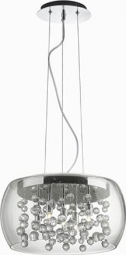 Moderní závěsné svítilo AUDI-80 SP5 z řady Ideal Lux se stínidlem z čirého skla elegantního tvaru a základnou z lesklého chromu je doplněn o skleněné ověsky připomínající kapky rosy. Svítidlo tak působí čistého dojmu. Světlo je díky skleněným ověskům lámáno a odráženo do prostoru. Skleněné...