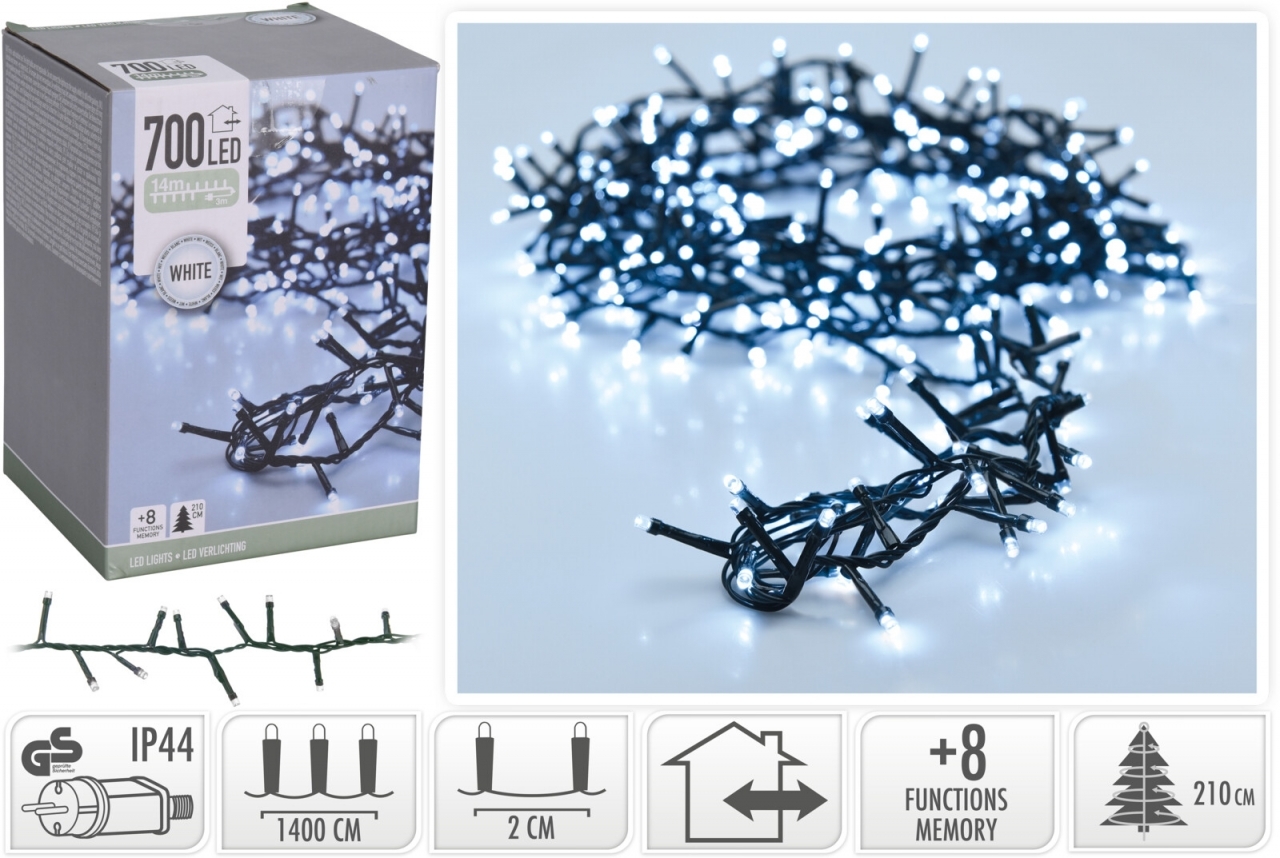 Dekorativní osvětlení do interiéru i exteriéru.700 LED, 5mm žárovkydélka osvětlení 14 m + 3 m přívodový kabeladaptér IP44barva řetězu zelenábarva LED studená bílá8 funkcísvětelný řetěz na stomeček vysoký cca 210 cm przeczytaj całość