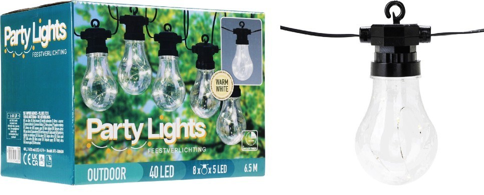 LED CHAIN WITH 8 BULBS, EACH BULB CONTAINS 5 WARM WHITE MICRO LED, IN TOTAL 40LED, 6X9CM BULB, BULB DISTANCE: 65CM, LEADWIRE: 2 METER, IP44. B/O, BATTERY BOX WITH TIMER, 8HRS ON/16HRS OFF, 3X AA BATTERIES NOT INCLUDED. EACH BULB IN PP BAG FOR PROTECTION, WITH NEW BULB COVERS, EACH IN COLOURBOX/...