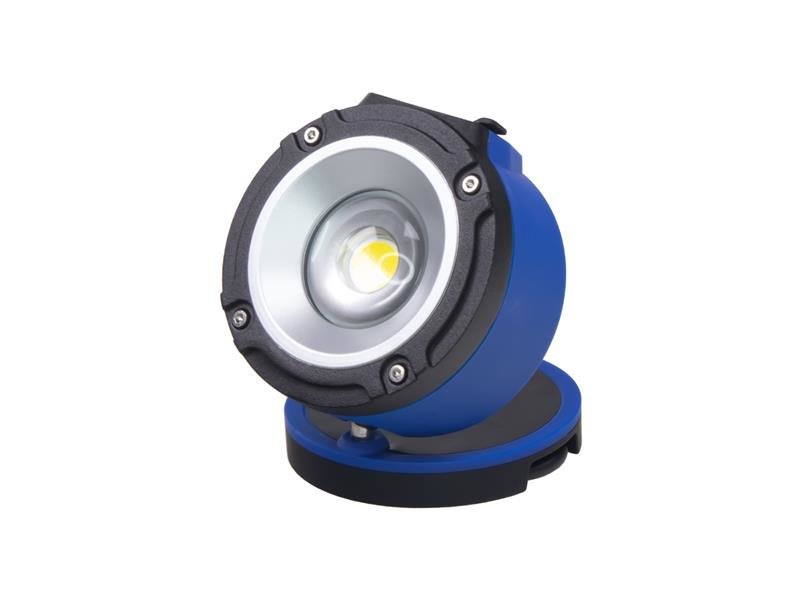 AKU LED profi pracovní / rekreační svítilna. Jako zdroj světla má 6W COB LED modul. Konstrukčně je COB LED tvořena jednotlivými čipy, umístěnými na plošném spoji a pokryta vrstvou luminoforu, vytvářející dohromady homogenní svíticí plochu. Tyto moduly pak vyzařují světlo téměř souvisle po celé ploše. Díky montáži přímo na hliníkový plát se moduly méně zahřívají a významně se tak prodlužuje životnost. Montážní lampa má praktický design a možnost uchycení pomocí magnetu. Nespornou výhodou je absence kabelu.