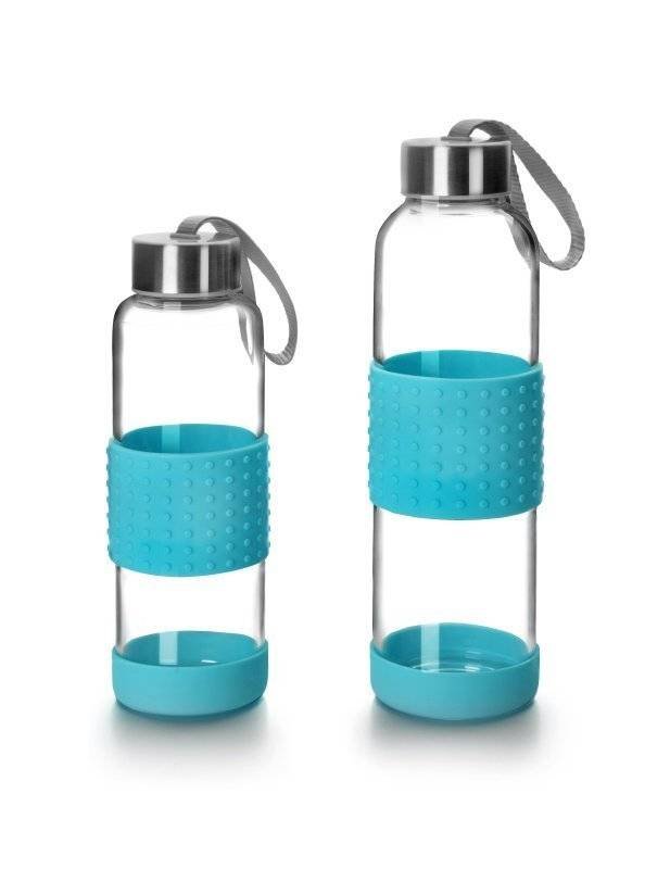 Praktická skleněná láhev s nerezovým víkem a barevnými gumovými drážkami. . przeczytaj całość