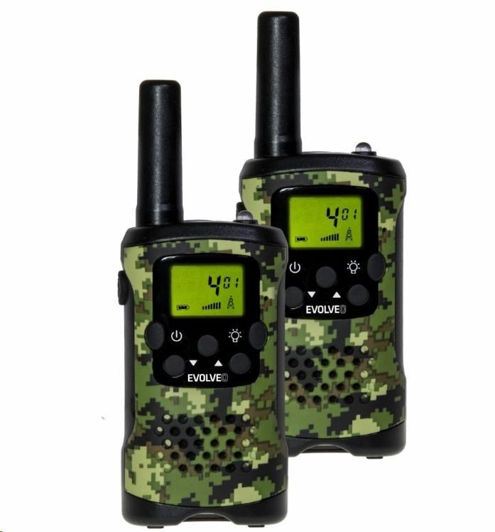 Dostarczane z akumulatorami do ładowania, duży wyświetlacz, zasięg do 8 km w terenie otwartym, moc 0,5 W, standard PMR446, VOX, CALL, Roger Beep, CTCSS, wbudowana latarka LED, kolor Army camouflage