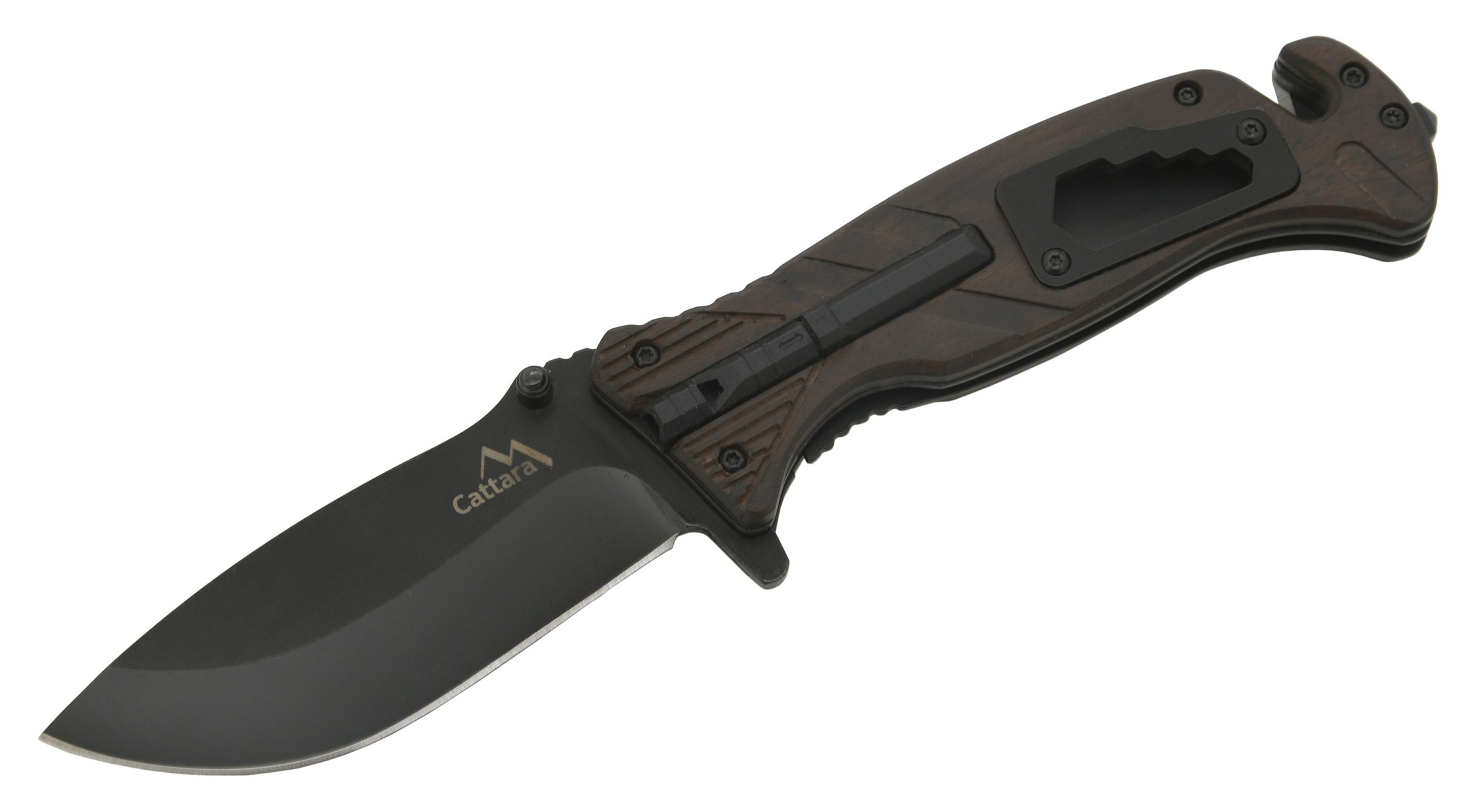 Ergonomiczne okładziny imitujące drewno zapewniają wygodny i pewny chwyt, a blokada oraz system szybkiego otwierania jedną ręką zwiększają bezpieczeństwo i komfort użytkowania. Dzięki klipsowi łatwo przypniesz go do paska i będziesz mieć zawsze pod ręką.