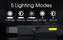 Pozwala dostosować strumień światła do warunków. Między ustawieniami można przełączać się lekkim naciśnięciem wielofunkcyjnego przycisku. Jasna lampa COB, przyciemniona lampa COB, jasna latarka, przyciemniona latarka oraz tryb migania (aktywowany długim naciśnięciem włącznika).