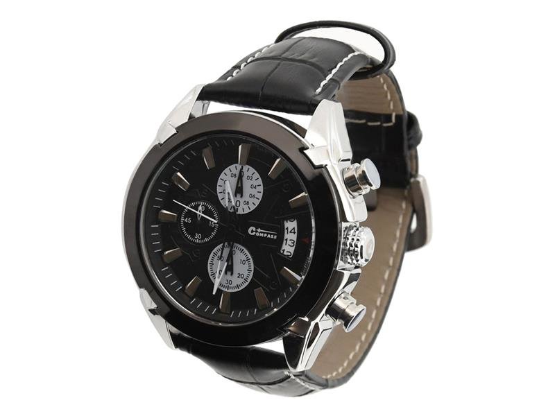 Chronograf s elegantním designem černé barvy, s vystouplými stříbrnými indexy a černým koženým páskem. Přesný chod hodinek je zajištěn elektronickým oscilátorem, řízeným krystalem. Hodinky jsou zhotoveny z kvalitního odlitku kovu, opatřeny sklíčkem z Hardlexu - křemíkové sklo s vrstvou korundu. Materiál je super čirý s dobrými pozorovacími úhly a odolává poškrábání, korozi i vodě. Pásek je kožený s klasickým zapínáním s volbou 7 pozic. Mezi funkce patří stopky s přesností 1/100 s, datum, samotné analogické hodiny a vodotěsnost do 3 Bar.