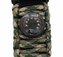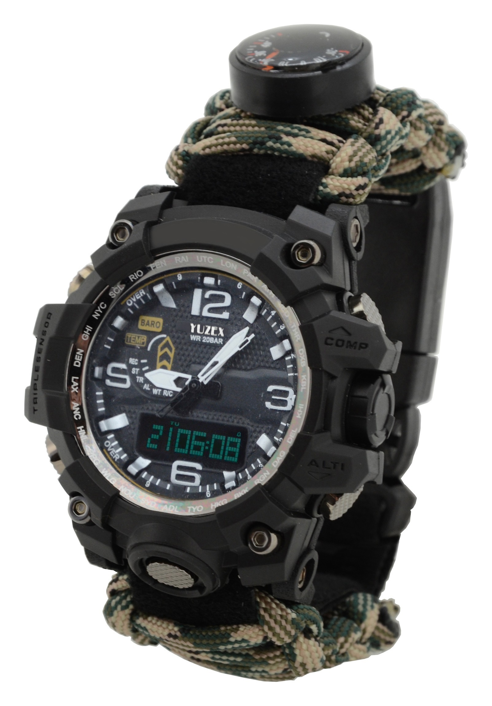 Vodotěsné outdoorové hodinky do přírody, kde využijete jejich bohaté výbavy, vhodné i pro běžné nošení. Hodinky jsou kombinované, analogové s podsvětlenými digitálními a mají funkce jakými jsou stopky, budík s možností prodloužení buzení, 12 i 24 hodinový formát času a datum. Navíc jsou hodinky vodotěsné. Další výbavou hodinek jsou kompas, teploměr, píšťalka a řemínek opletený paracordem ve vzoru kobra, který je možné v nouzovém případě kompletně rozplést a použít jako provaz. Řemínek lze snadno a rychle nastavit podle ruky. Konce řemínku jsou opatřeny zakončením v podobě křesadla z magnesiové tyčky a škrtátka z oceli s vysokým poměrem uhlíku. Vzniklá jiskra dosahuje teplot až 2000°C a dokáže zapálit plynový vařič, papír, nebo drobné, suché větvičky.