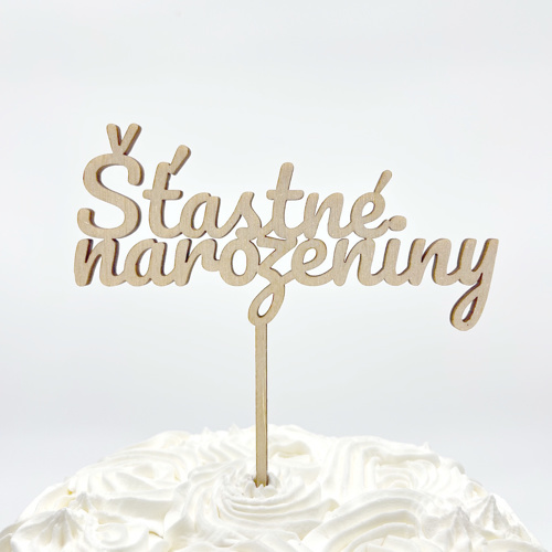 Ozdobny drewniany topper na tort w kształcie napisu 'Šťastné narozeniny'. Ta dekoracyjna drobnostka pięknie ozdobi Twój tort. Wyprodukowano z miłością w Czechach. Rozmiar 135 x 190 mm. Opakowanie 1 szt. przeczytaj całość
