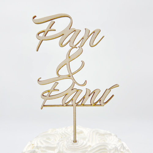Ozdobny drewniany topper na tort w kształcie napisu "Pan i Pani". Ta dekoracyjna drobiazg, którą czasami nazywa się topperem lub po prostu dekoracją na tort, pięknie ozdobi tort. Wyprodukowano z miłością w Czechach. Rozmiar 145 x 200 mm. Opakowanie 1 szt. przeczytaj całość