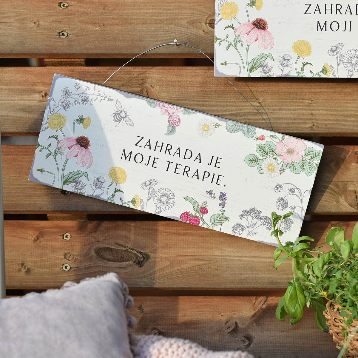 Zahradní dekorace ze dřeva - Zahrada je moje terapie. Pro ty, kteří svůj čas tráví nejraději na zahradě jsme vytvořili tyto krásné cedulky.Znáte to... Přijdete domů z práce a jdete se odreagovat na svoji oblíbenou zahradu. Spousta zeleně, květin, vůní a radost, že tento zahradní chrám je Váš....
