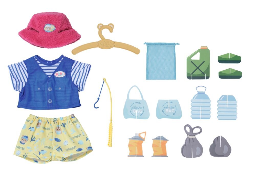 Ve stylovém rybářském oblečku je medvídek BABY born nejen nepřehlédnutelný, ale také skvěle vybavený: kromě roztomilé košile s vestičkou, kalhot a růžového huňatého rybářského kloboučku sada obsahuje také rybářský prut, který lze použít k lovu různých předmětů, které do přírody nepatří: medvídek...