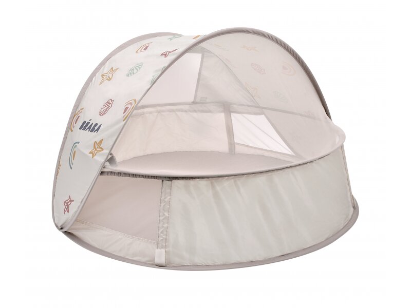 Przenośny, uniwersalny namiot z filtrem UV 50+ do ochrony dziecka przed słońcem w ogrodzie, na plaży lub podczas wycieczek na łonie natury. Namiot umożliwia łatwą wentylację dzięki bocznym otworom z siatką oraz materiałowym klapom, które można zwinąć. Siatka chroni dziecko w namiocie przed uciążliwymi owadami. Tkanina o chłodzącym efekcie pomaga obniżyć temperaturę wewnątrz namiotu.