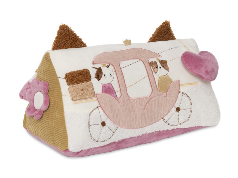 Měkký trojhranný polštářek ve tvaru pohádkového zámku nabízí spoustu aktivit pro zábavu i rozvoj smyslů vašeho miminka. Tvar polštářku je ideální pro hraní v poloze na bříšku, která přináší dítěti jiný pohled na svět a posiluje krční a zádové svaly, které mu později umožňují začít se přetáčet,...