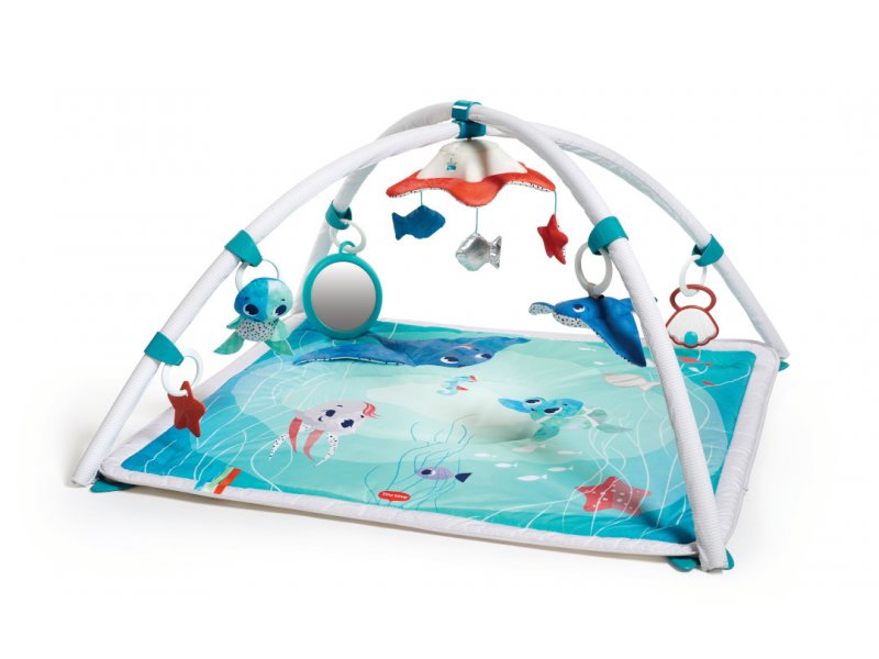 Mata do zabawy z pałąkiem Tiny Love z pięknymi motywami życia pod powierzchnią morza oferuje różnorodne aktywności, które bawią i stymulują zmysły dziecka od urodzenia.