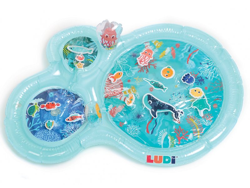 Interaktywna mata do zabawy wypełniona wodą przypomina prawdziwy podwodny świat z morskimi zwierzętami. Figurka morskich stworzeń poruszają się w wodzie wewnątrz maty, gdy tylko dziecko dotknie maty ręką. Poszczególne części maty są połączone, dzięki czemu gdy dziecko oprze się na macie, woda przepływa między jej częściami. Na nadmuchiwanych brzegach znajdują się dwa nadmuchiwane uchwyty, które przy naciśnięciu piszczą i dźwięczą.