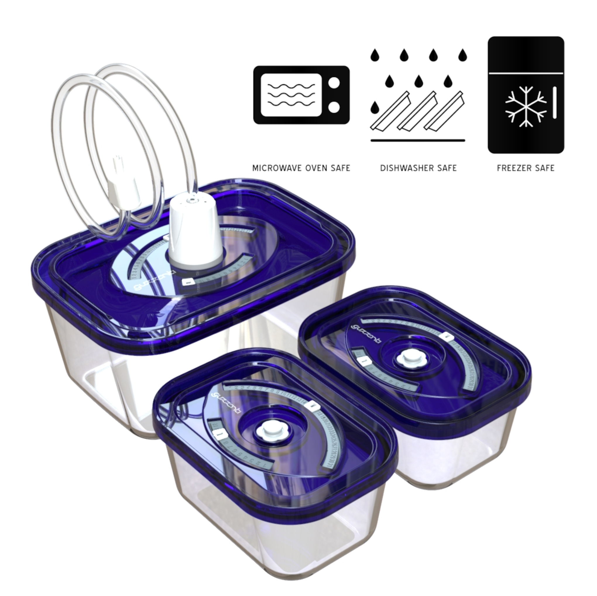 2 x 500 ml + 1 x 1500 ml oraz adapter Przeznaczone do próżniowych zgrzewarek do żywności Guzzanti Materiały bezpieczne dla zdrowia i certyfikowane: szkło, ABS i silikon Możliwość oznaczenia dnia i miesiąca na pokrywce pojemnika Nadają się do podgrzewania w kuchence mikrofalowej, przechowywania w lodówce i zamrażarce, można myć w zmywarce Nadają się do przechowywania produktów suchych, wilgotnych i kruchych Idealne do marynowania Do bezpiecznego przechowywania resztek jedzenia i dań na wynos