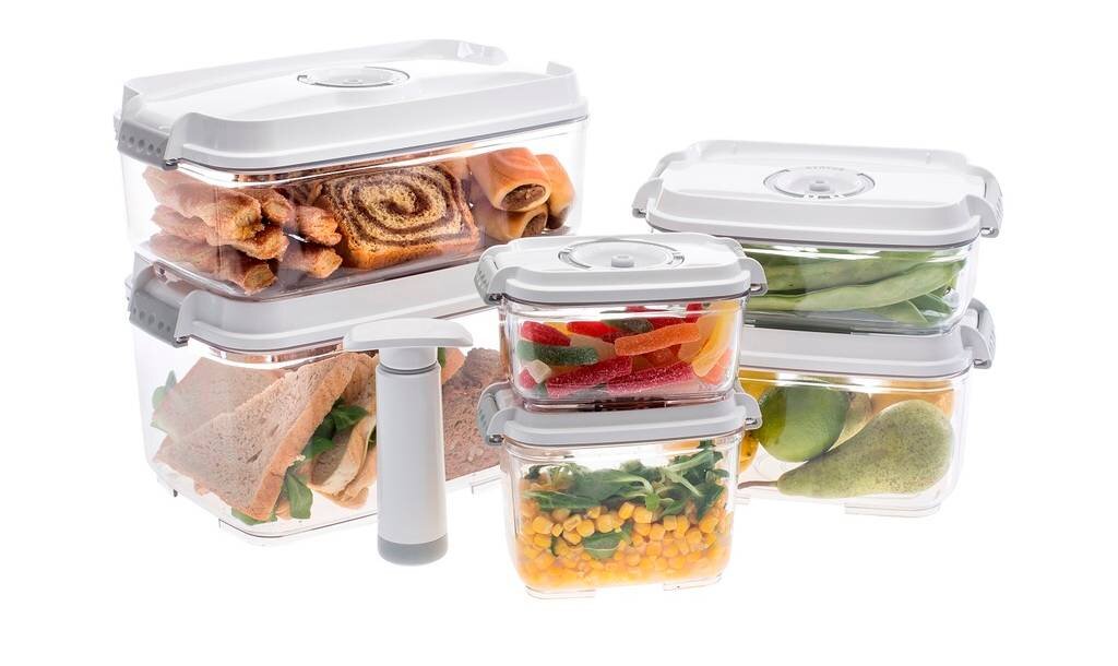 - Materiál: TRITAN - vysoce kvalitní materiál bez BPA, který vydrží po generace (ze stejného materiálu se vyrábějí okna v letadlech, tzv. umělé sklo). Je zdravotně nezávadný, extrémně odolný proti nárazům, neabsorbuje barvu ani vůni uložených potravin. Ventily dóz jsou vyrobeny ze silikonu. Ostatní části jsou vyrobeny z plastu ABS, který zajišťuje pevnost materiálu. Dózy jsou vhodné do mikrovlnné trouby, chladničky, mrazničky a myčky nádobí.