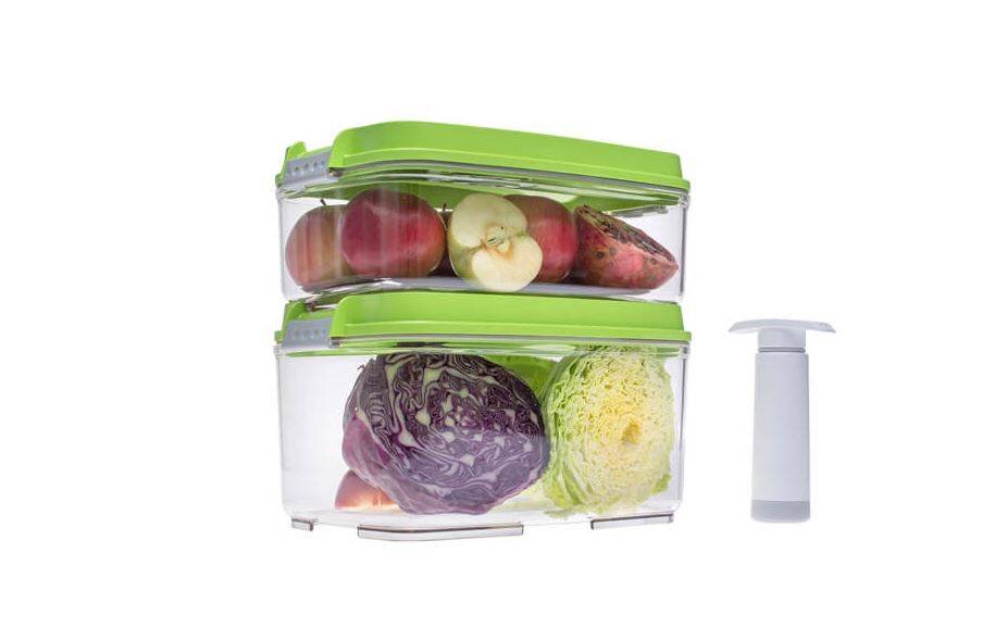 Zestaw zawiera dwa prostokątne pojemniki o pojemnościach 1,4 l i 2 l oraz wysokiej jakości ręczną pompę próżniową, dzięki której łatwo usuniesz powietrze i utrzymasz produkty spożywcze w idealnym stanie. Pojemniki wykonano z nowoczesnego materiału TRITAN, który jest bezpieczny dla zdrowia (bez BPA), bardzo odporny na uderzenia oraz nie wchłania zapachów ani barw żywności. Zawory z miękkiego silikonu zapewniają niezawodne uszczelnienie, natomiast użycie plastiku ABS nadaje pojemnikom niezbędną wytrzymałość i stabilność.