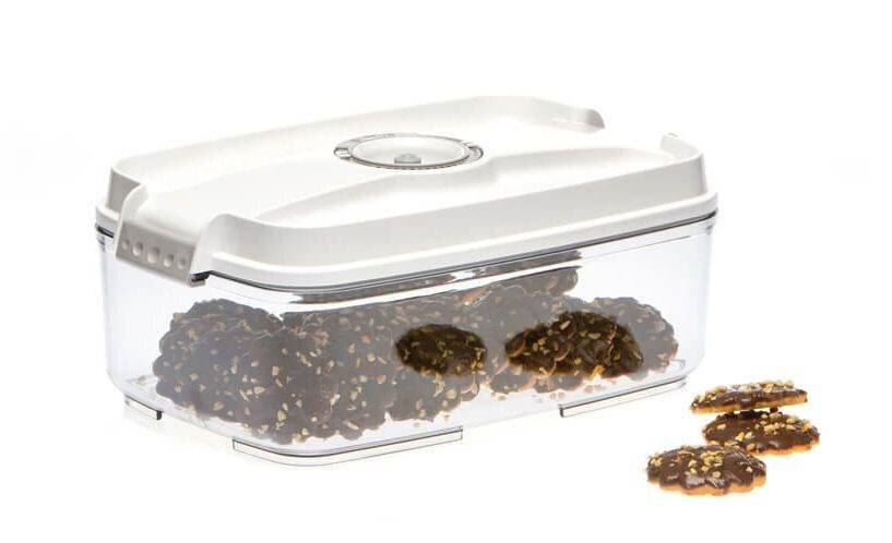 Vakuovací box 1,4 l (bílé víčko) Materiál: potravinářský nezávadný, kvalitní TRITAN plast (stejný materiál je použit na výrobu oken v letadlech, tzv. Umělé sklo) neabsorbující barvu ani aroma skladovaných potravin. Těsnění a ventil jsou vyrobeny ze silikonu a zbytek z ABS plastu, který zajišťuje...