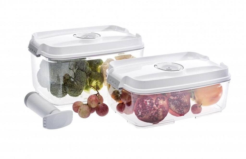 Obsah balení: 1,4l a 2l obdélníková dóza; ruční vakuová pumpa. Materiál: TRITAN - vysoce kvalitní materiál bez BPA, který vydrží po generace (ze stejného materiálu se vyrábějí okna v letadlech, tzv. umělé sklo). Je zdravotně nezávadný, extrémně odolný proti nárazům, neabsorbuje barvu ani vůni...
