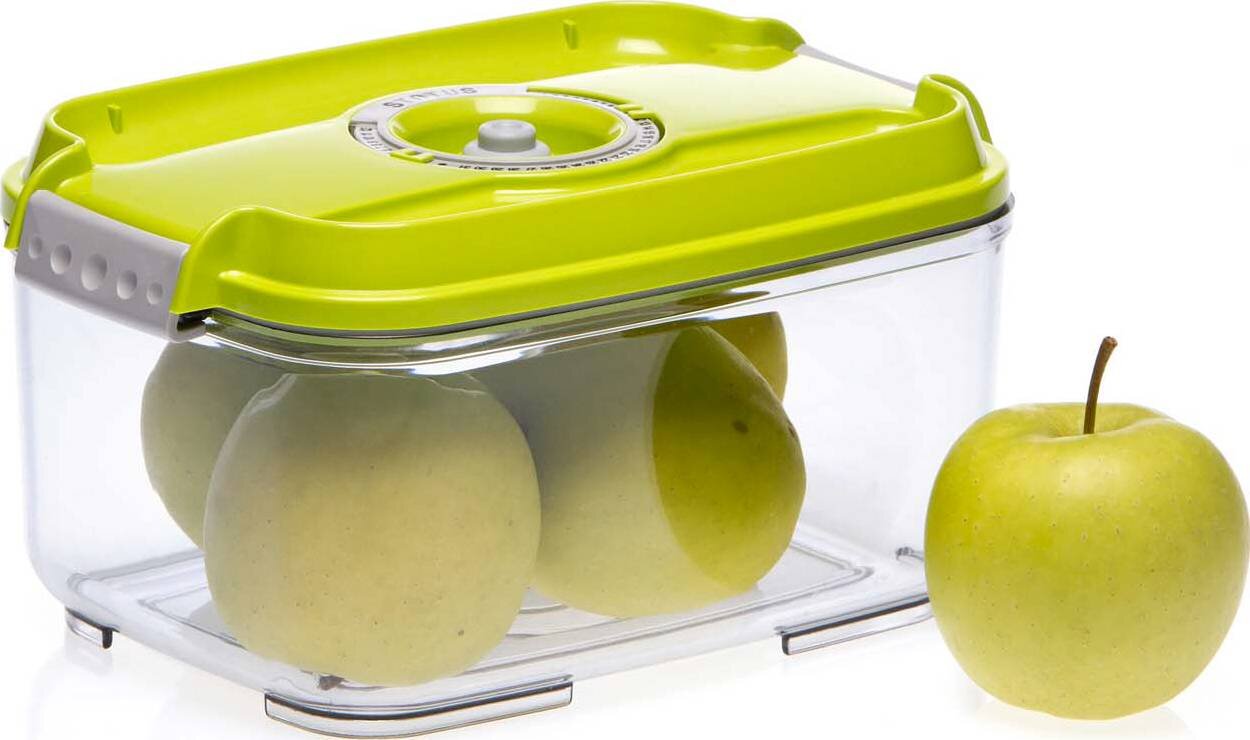 Vakuovací box 2 l (zelené víčko) Material: potravinářský nezávadný, kvalitní TRITAN plast (stejný materiál je použit na výrobu oken v letadlech, tzv. Umělé sklo) neabsorbující barvu ani aroma skladovaných potravin. Těsnění a ventil jsou vyrobeny ze silikonu a zbytek z ABS plastu, který zajišťuje...