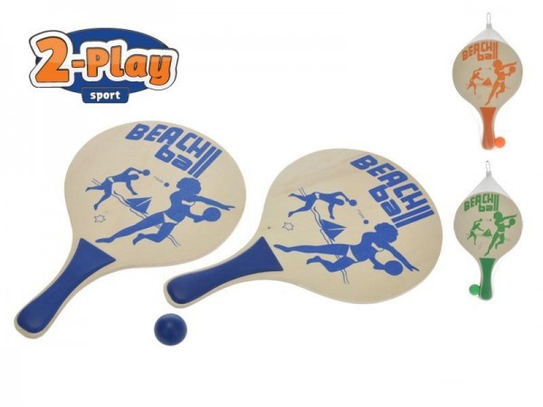 Plážová sada pálky 2ks dřevo 38x24cm s míčkem asst 3 barvy v síťce