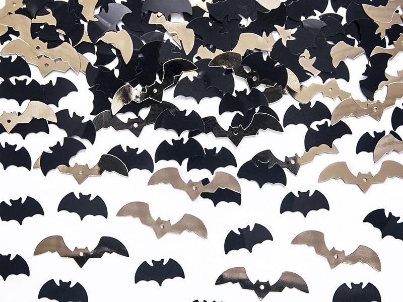 Konfetti Nietoperze w kolorze czarnym i złotym, wymiary 1,7x0,7 centymetra, 2,5x0,7 centymetra. przeczytaj całość