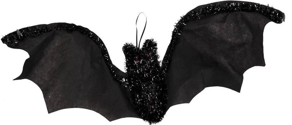 Duży nietoperz w kolorze czarnym. Dekoracja do zawieszania. Obrzeża skrzydełek oraz korpus nietoperza posiadają ozdobne, połyskujące wykończenie. Oryginalna dekoracja na imprezy z okazji halloween, przyjęcie tematyczne, dekorację domu strachów. Nietoperz o wymiarach 81x23 cm. przeczytaj całość