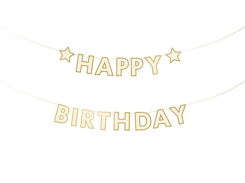 Baner papierowy Happy Birthday w kolorze biało-złotym. Wysokość ok. 14.5 cm, długość sznurka ok. 3 m. Produkt do samodzielnego złożenia. przeczytaj całość