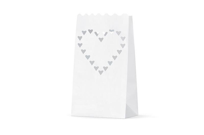 Lampiony na świece w kształcie torebek w kolorze białym, z motywem serca, wymiary 15x9x26 centymetrów. Wykonane z niepalnego papieru.(1 op. / 10 szt.) przeczytaj całość