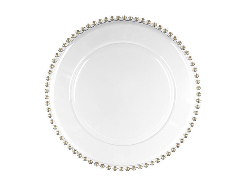 Podtalerz z perłami wykonany z transparentnego plastiku, średnica ok. 32 cm i głębokość 3 cm. przeczytaj całość